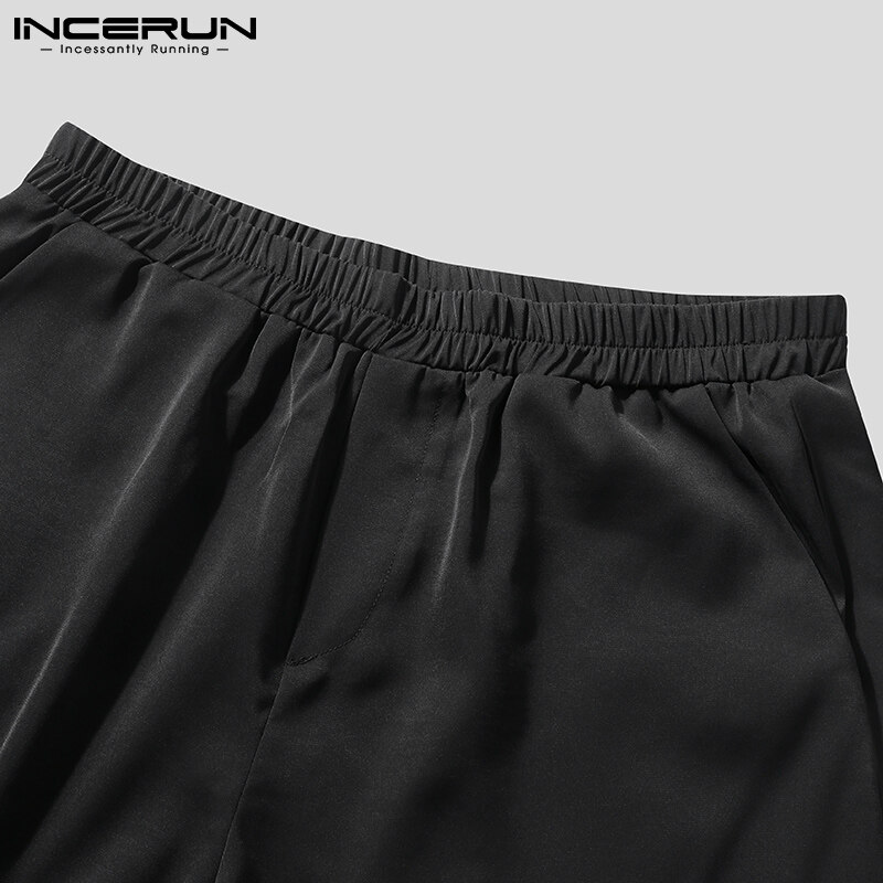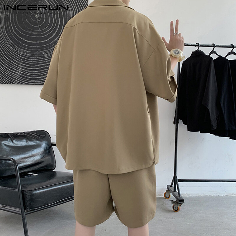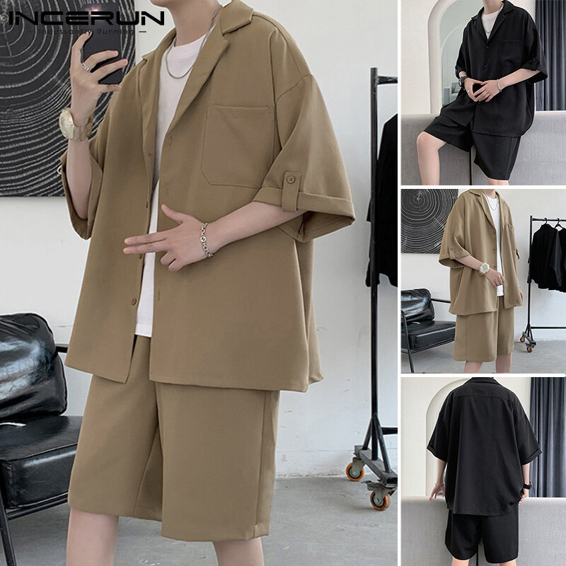 INCERUN男式短袖韩式休闲西装纽扣衬衫弹性腰间短裤套装(韩式)