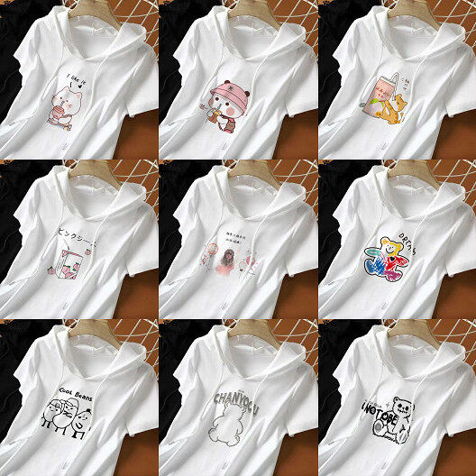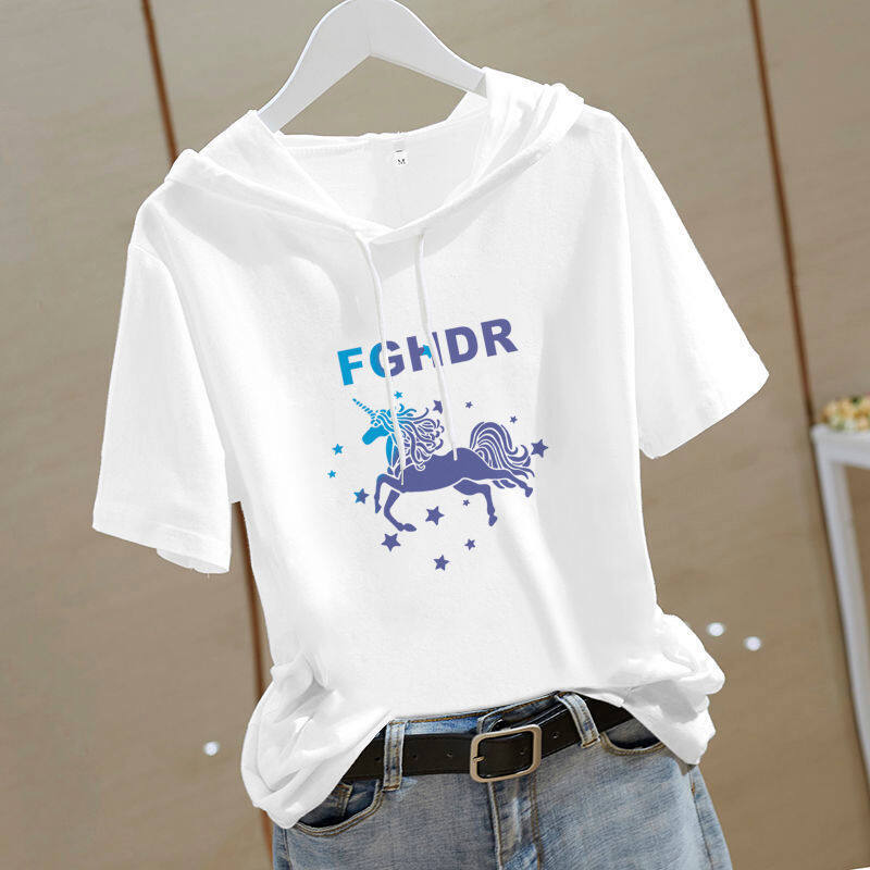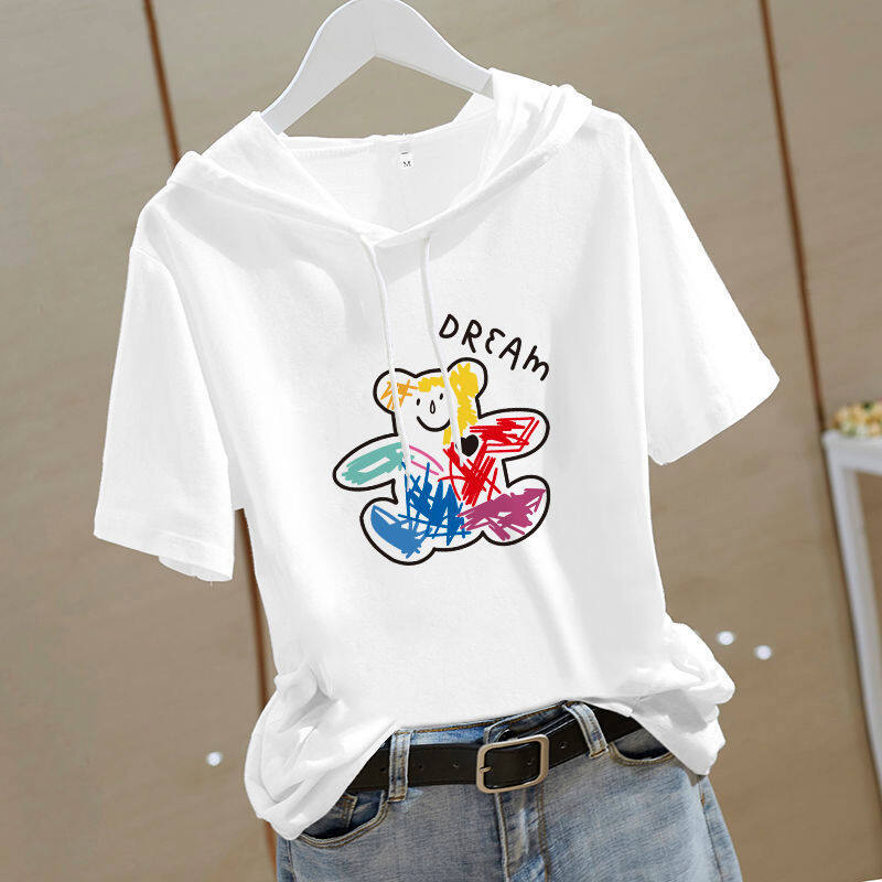 韩国上衣女士印花女士T恤宽松短袖休闲上衣女士衬衫女士时尚上衣夏季女士白色上衣短袖连帽衫